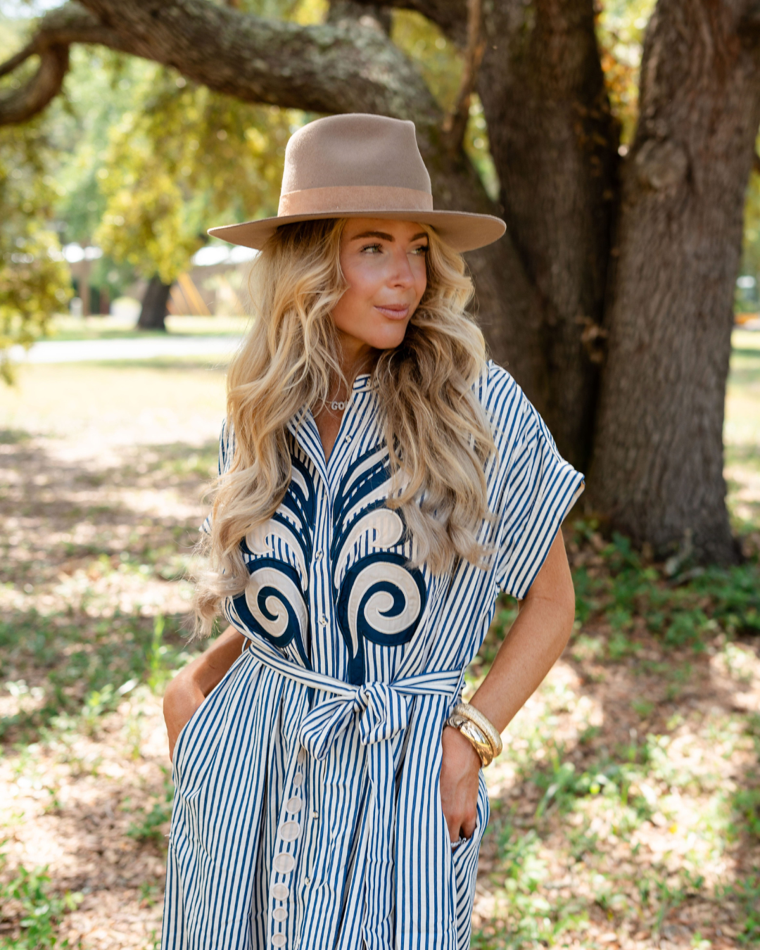 The Blue Harvest Midi Dress brings a touch of artful charm to your fall wardrobe. Featuring abstract embroidered appliqué accents, this short sleeve midi shirt dress stands out in a rich blue hue that’s perfect for the season. Designed with a removable self-belt to define your waist and side pockets for a practical finish, its lightweight woven fabric makes it easy to wear from crisp mornings to cozy evenings. Pair with boots or layered knits for an effortlessly chic autumn look.