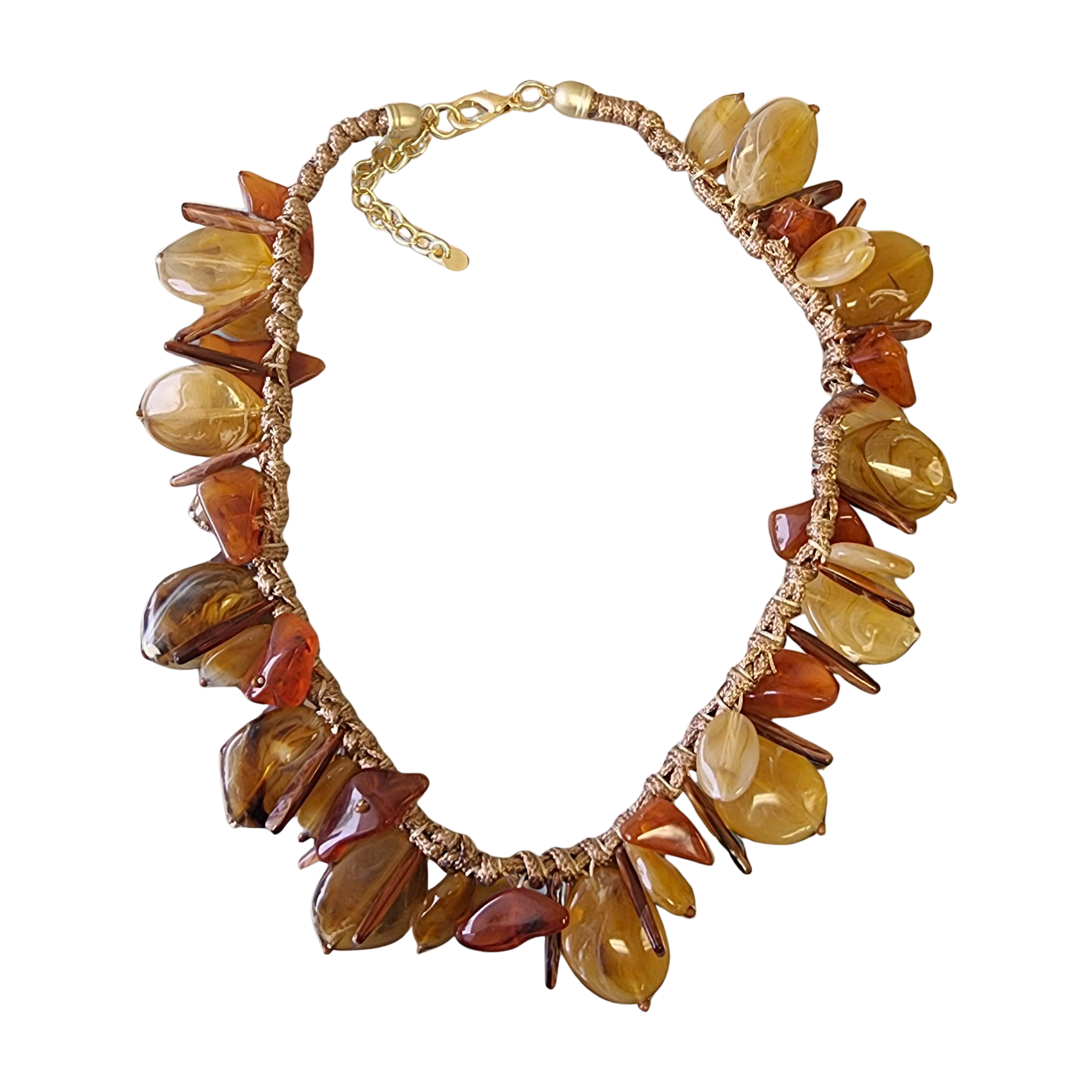 Elevate your fall wardrobe with this handmade statement choker, designed to bring a touch of earthy elegance to any look. Featuring a double-knotted faux suede cord in rich mocha, this piece is accented with baroque resin beads in warm, neutral amber shades, creating a beautifully organic feel. Measuring 17" with a 3" extender and finished with a secure lobster clasp, it’s the perfect accessory to pair with cozy knits, flowing dresses, or layered fall looks.
