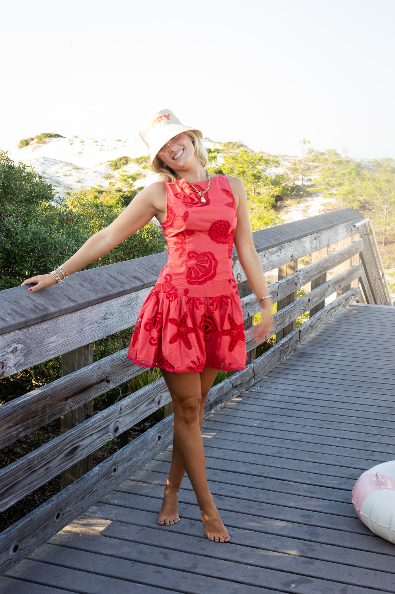 Coral Dress is a vibrant red mini featuring delicate eyelet cutouts in charming shapes like clams, shells, and starfish for a playful coastal vibe. Designed with a classic round neckline and sleeveless cut, it keeps you cool and chic. The peplum-style skirt adds a flirty, feminine touch that moves beautifully with every step.