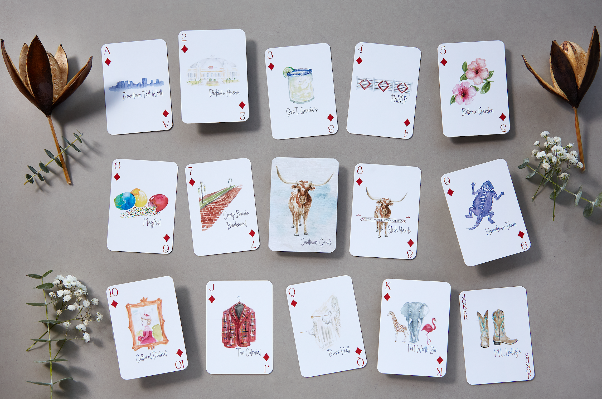 Fort Worth, Texas themed playing cards featuring 14 different unique watercolor images. Including Downtown, Dickie's Arena, Joe T Garcia's, the Botanic Gardens, Mayfest, Camp Bowie Boulevard, the Stock Yards, Horned Frog, the Cultural District, The Colonial, Bass Hall, the Fort Worth Zoo, M.L. Leddy's.