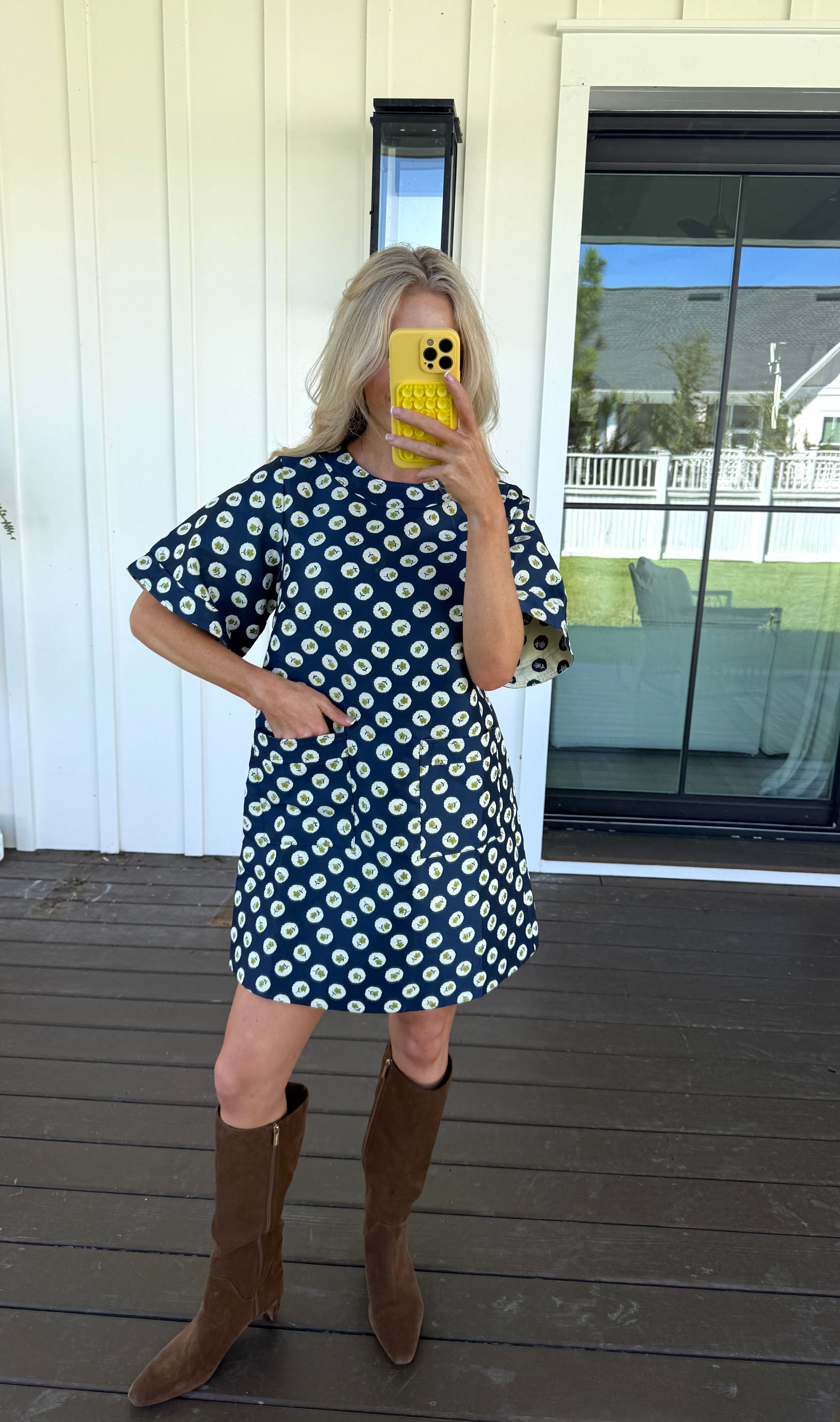 The flower dot dress is a MOD look mini dress perfect for fall weather. Its stylish flower pattern is beautifully contrasted against polka dots, creating a unique and eye-catching design. With 2 pockets at the front and a back key hole with buttons, this mini shift dress is both functional and fashionable. The band detail on the neck and cuff adds a touch of elegance to this must-have dress.