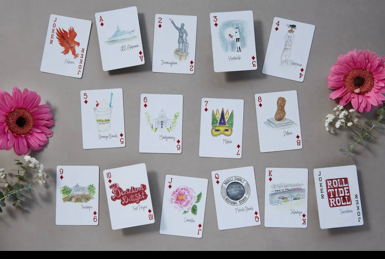 State of Alabama themed playing cards featuring 19 different unique watercolor images representing different cities and themes that make Alabama unique. Including, USS Alabama, Birmingham, Huntsville, Enterprise, Orange Beach, Montgomery, Mobile, Dothan, Fairhope, Fort Payne, the Yellowhammer, Cotton, Monarch and Camellia, Muscle Shoals, Talladega, Tuscaloosa and Auburn.