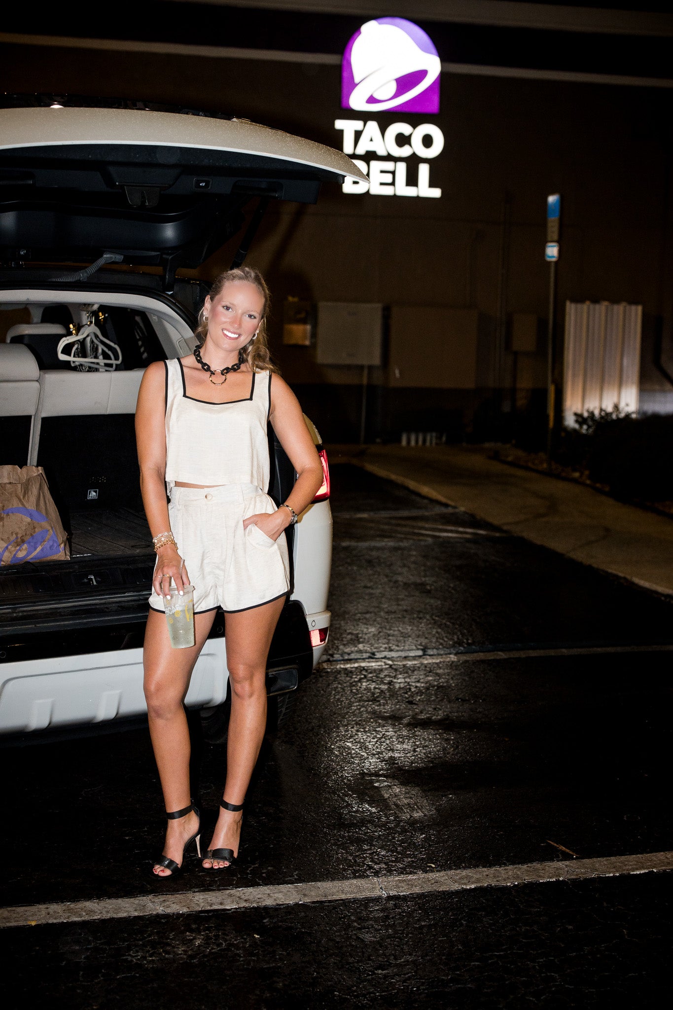 Luna Set is a two-piece linen set features a cropped, sleeveless top with a square neckline and black contrast lining for a clean, structured finish. Paired with coordinating trouser-style shorts, the set includes subtle black lining at the hem and practical side pockets for added functionality. Made from breathable linen, it's a lightweight yet polished option for warm-weather days.