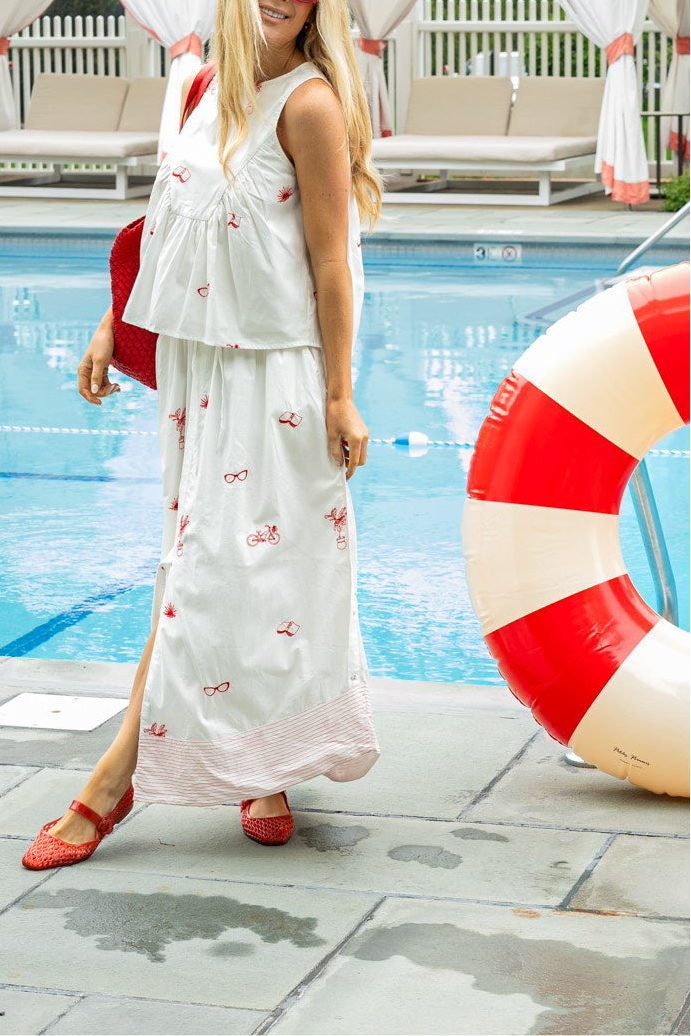 Rideway Set is a white set features delicate red embroidery of plants and a whimsical bike, adding a unique, artistic touch. The sleeveless top boasts a cinched design that flatters the waist, while the midi skirt combines a tie waist and garterized back for an adjustable, comfortable fit. Light, breezy, and full of personality, this set is perfect for sunny days, casual outings, or weekend adventures.