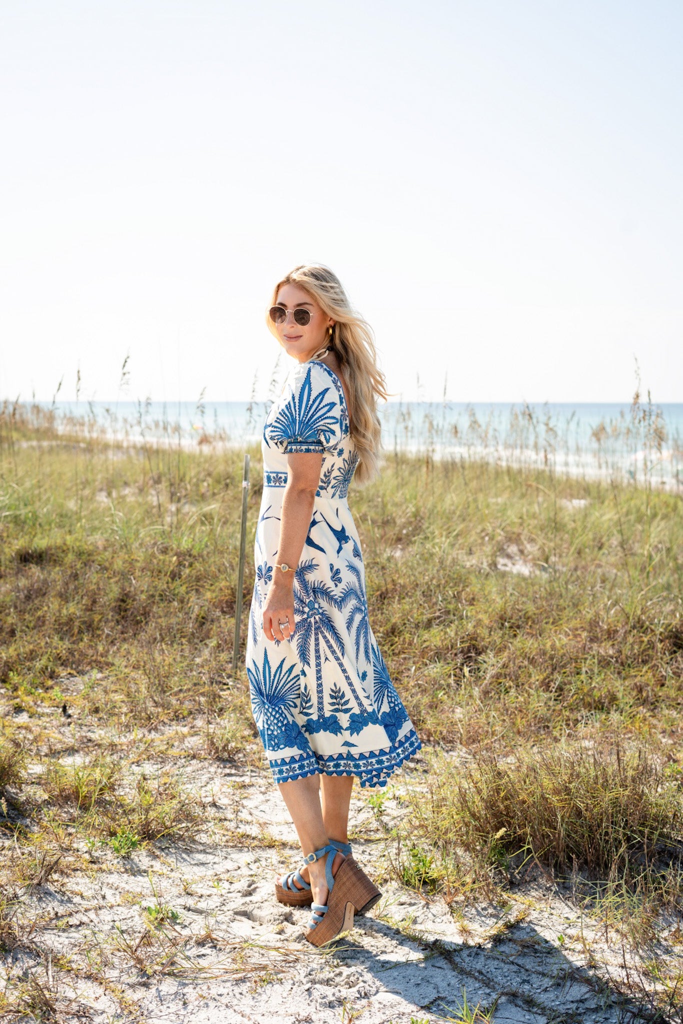The Selene Dress is a white maxi crafted with a graceful silhouette that falls just over the knees for a refined finish. Delicate puff sleeves add soft volume, while intricate Greek-blue patterns trace along the fabric, evoking the artistry of ancient Hellenic design. A modern ode to goddess-like beauty, this dress is made for effortless sophistication — from sunlit strolls to evening gatherings.