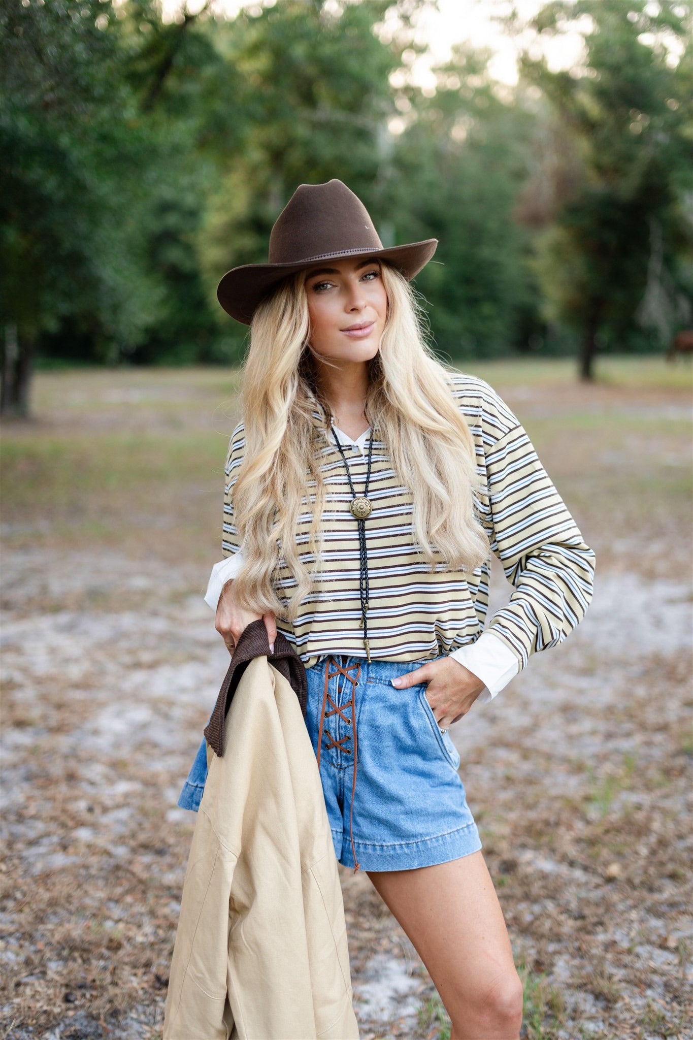 The Ranch Polo is crafted from soft cotton with narrow honey mustard and white stripes that feel timeless yet bold. Designed with a collared neck, button front, and long sleeves, it’s the kind of shirt that rides seamlessly between casual days and dressed-up nights — perfect for layering with denim, boots, and a little western edge.