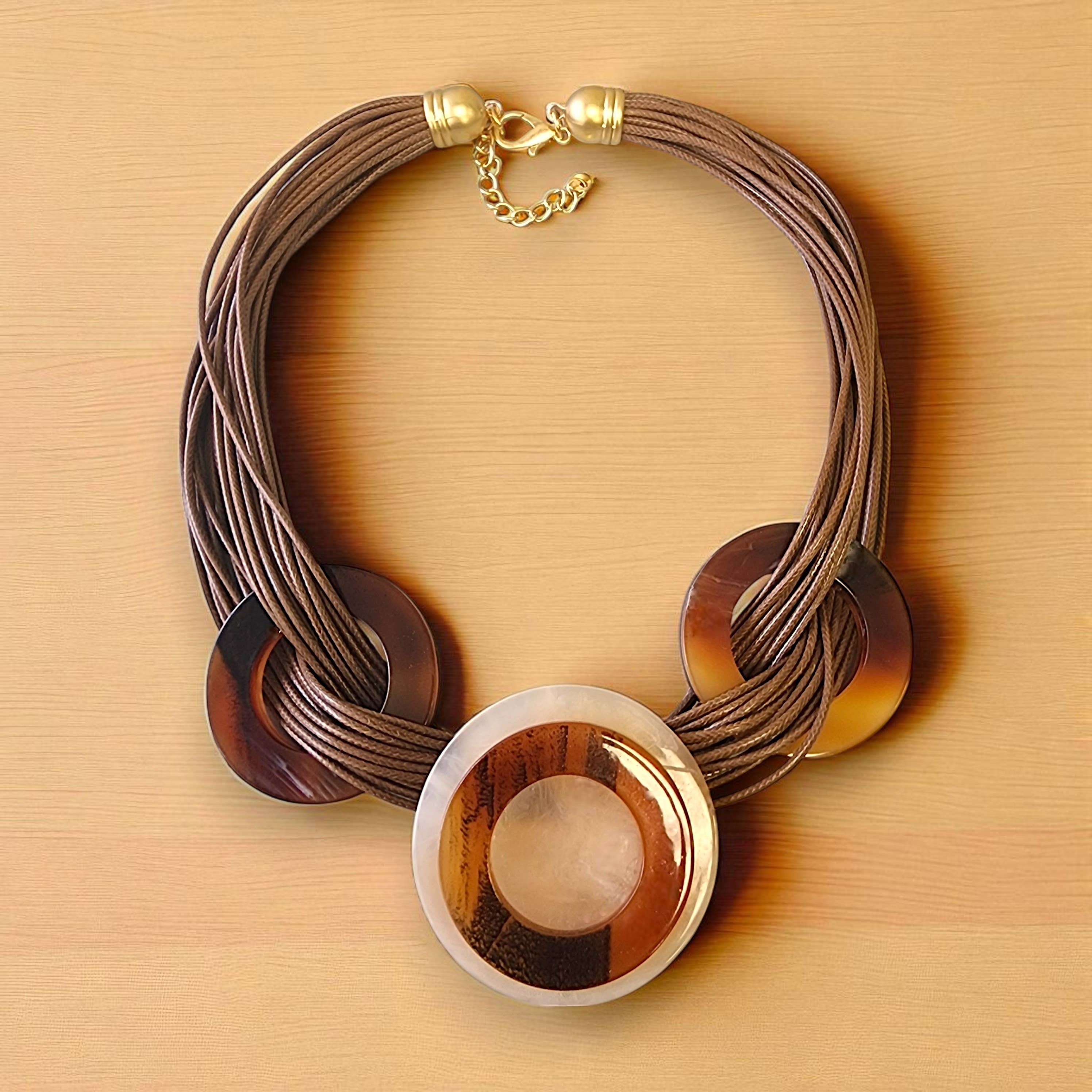 Bring runway vibes to your everyday style with the Tortoise Pendant Necklace. Featuring tortoise shell glass and resin circle pendants on a rich chocolate brown faux suede cord, this layered boho-chic piece is perfect for fall. With an 18" length plus a 3" extender and secure lobster clasp, it’s the ideal accessory to add a warm, coastal-inspired touch to any outfit.