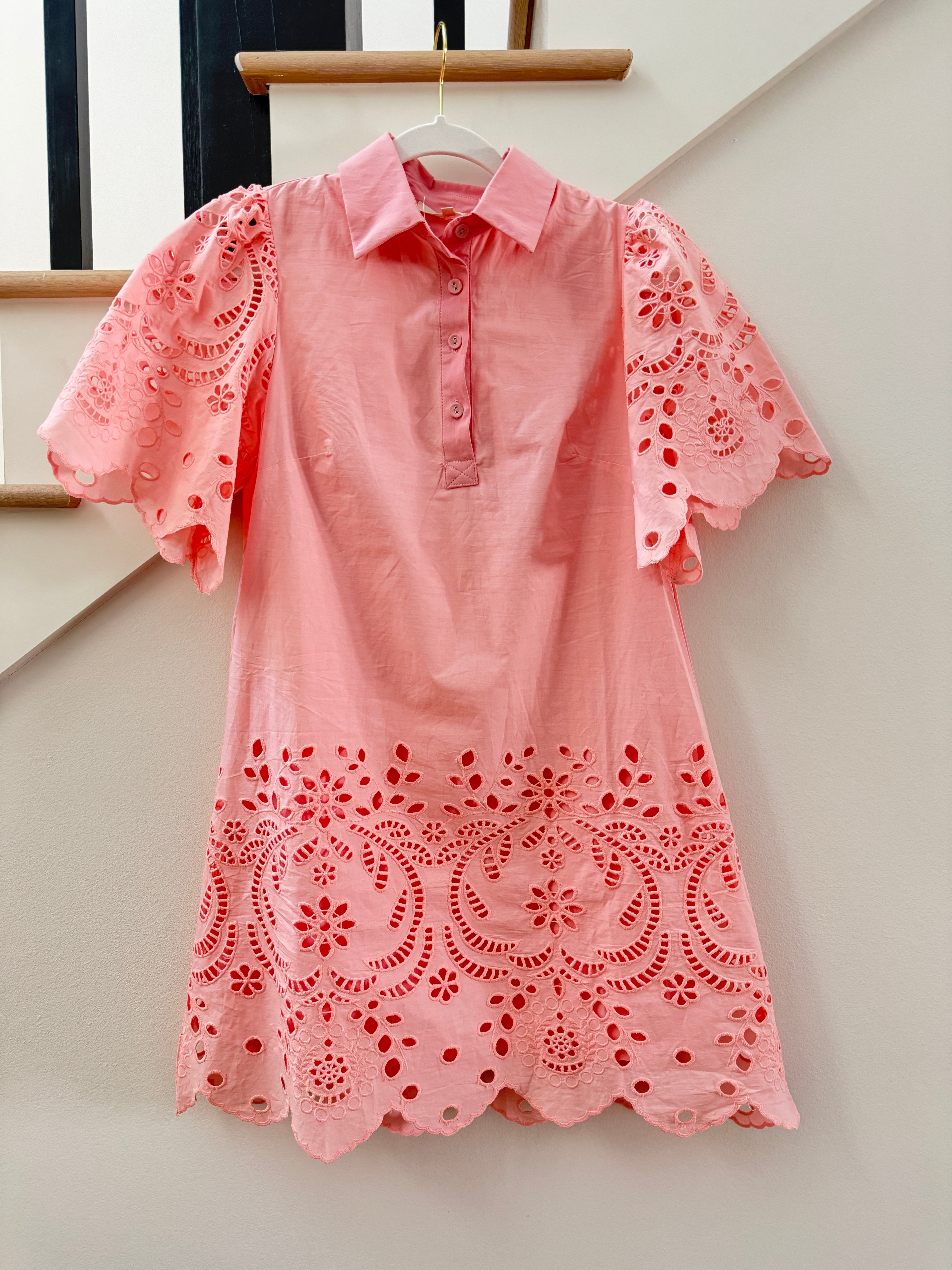 Delicate and playful, the Lilou Mini Dress features soft baby pink cotton poplin, intricate scalloped detailing, and charming puff sleeves. Its lightweight, breezy silhouette is perfect for spring days, casual outings, or garden gatherings.